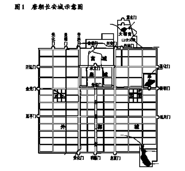 通过读图1,观察长安城的布局:皇城、宫城(太极宫)、大明宫、东市、西市等。从总体看,首先,长安城布局方正,街道笔直如棋盘,把整个城市分割成108坊和东西二市。坊类似于今天的居民区,市就是商业区。坊、市有围墙分开,管理严格。其次,长安城内河道纵横,古语有“八水绕长安”之说。不论是在宫城里,还是在西市、东市等其他地区,都有河道湖泊,城东南角有曲江池。政治中心在城市北部。这种城市布局是按照古人观念与天上的星宿相对应而设计的。长安的城门,如玄武门等,也与唐朝政治事件有密切关系。唐太宗时期许多重大政治活动都在宫城举行。大明宫在唐高宗时期建成,后成为政治中心。这种布局与北宋东京政治中心位置明显不同。