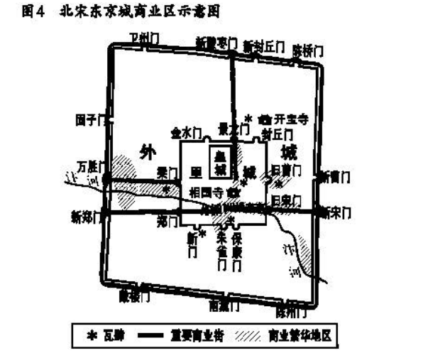 唐朝时候长安为西京,洛阳为东京(都)。到北宋时期则以洛阳为西京,以都城汴梁(今开封)为东京。宋周邦彦《汴都赋》中说“舳舻相衔,千里不绝,越般吴艚,官艘贾舶,闽讴楚语,风帆雨楫,联翩方载,钲鼓镗锘。”《东京梦华录》序中说,东京商业“万国咸通,集四海之珍奇,皆归市易”。《续资治通鉴长编》记,北宋东京人口“比汉、唐京邑民庶,十倍其人矣”,是当时世界人口最多的城市之一。