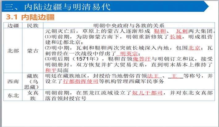 三、内陆边疆与明清易代 | 出示表格内容,问:在明朝,威胁陆疆的民族势力主要有哪些?明政府是如何经略这些地区的?结果如何?