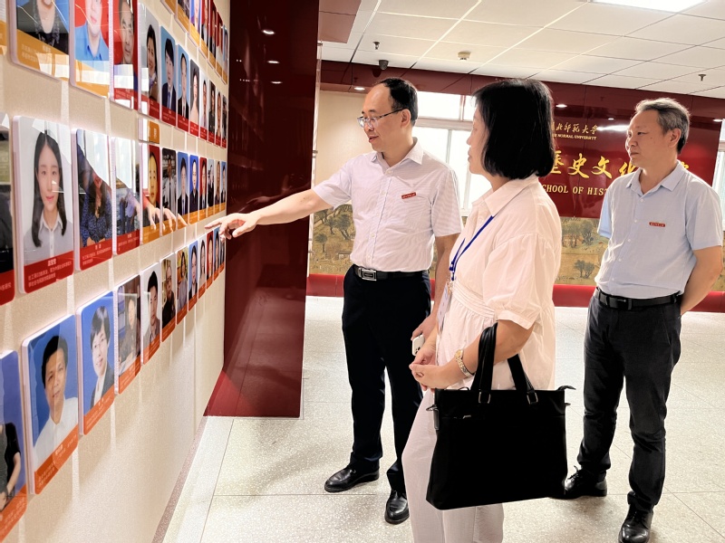 29日下午,专家组成员杜芳、丁修真、郭世杰分别参观了学院教师技能实训室、历史综合实验室、陈列室、文化墙。学院党委书记李涛和院长蔡明伦向专家介绍了教师技能实训室,此实训室突出“观摩、训练”的设计定位,主要服务于学生历史教学、中学历史师资培训,加强师范生综合技能训练、提升师范生教学技能,从而实现学生由“学会”到“会学”的能力转变,丰富第二课堂的同时,致力于打造别具特色的学习氛围。学院张泰山教授向专家介绍陈列室摆放的展品及其背后的故事,陈列室不仅为历史学专业学生提供学习实践基地,还成为对外交流的文化窗口。学院党委书记李涛和院长蔡明伦从师资力量、优秀毕业生、党建工作、学生工作等维度介绍了学院文化墙的内容和设置的含义。