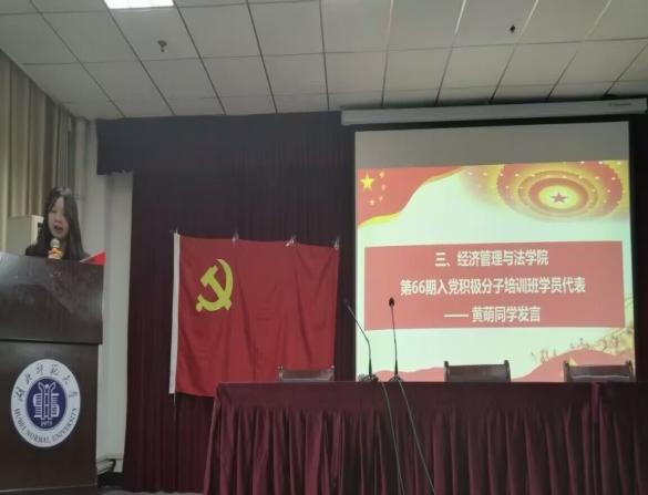 随后,经济管理与法学院第六十六期优秀学员代表黄萌从自身对党的认识出发,介绍了自己一步步用实际行动向党组织靠拢的心路历程,并鼓励在场学员努力学习,用实际行动提高思想领悟,向党组织靠拢,彰显时代新人的精神风貌。