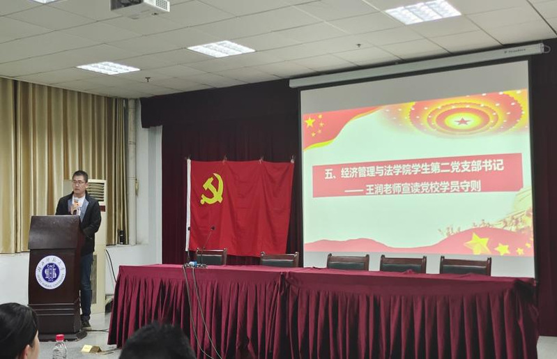 典礼第五项,经济管理与法学院学生第二党支部书记王润宣读了学员纪律守则与党校管理规定,从考勤、纪律、作业、考试等多方面内容做出详细规定,希望各位学员自觉遵守。