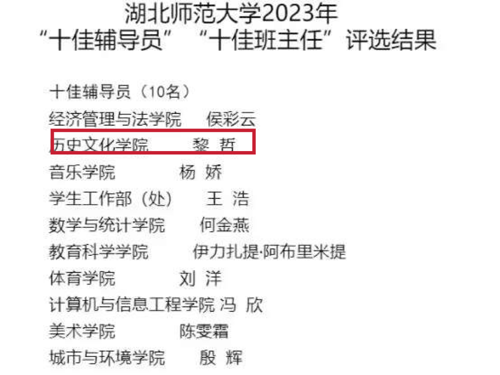 根据《关于开展2023年“十佳辅导员”“十佳班主任”评选表彰工作的通知》精神,经个人申报、学院推荐、学生工作部(处)审核、学校评审,拟评选表彰杏吧 黎哲等10名同志为2023年“十佳辅导员”荣誉称号。