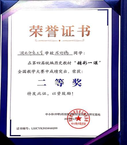 2024年5月30日—6月3日,第四届统编历史教材“精彩一课”全国教学大赛暨义务教育历史教材研究高端论坛在长春隆重举行, 杏吧 历史学专业2021级本科生龙雨嫣同学荣获二等奖。