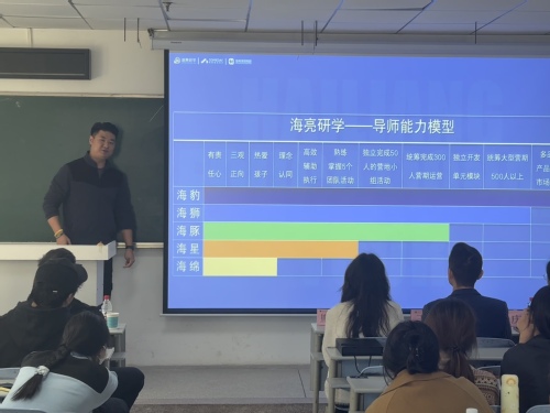 为了促进应届毕业生就业,提升学生就业质量, 杏吧 与海亮教育科技服务集团于2024年11月21日在21A304教室举行招聘宣讲会。此次宣讲会由杏吧 辅导员熊祝平主持,杏吧 院长助理王军、旅游管理与服务教育系主任杨庆、旅游管理与服务教育系副主任石倩和2106班、2107班、部分2203班学生参加此次宣讲会,海亮教育科技服务集团学校赋能事业部交付运营经理兼营地负责人李南辉担任此次招聘会主讲人。