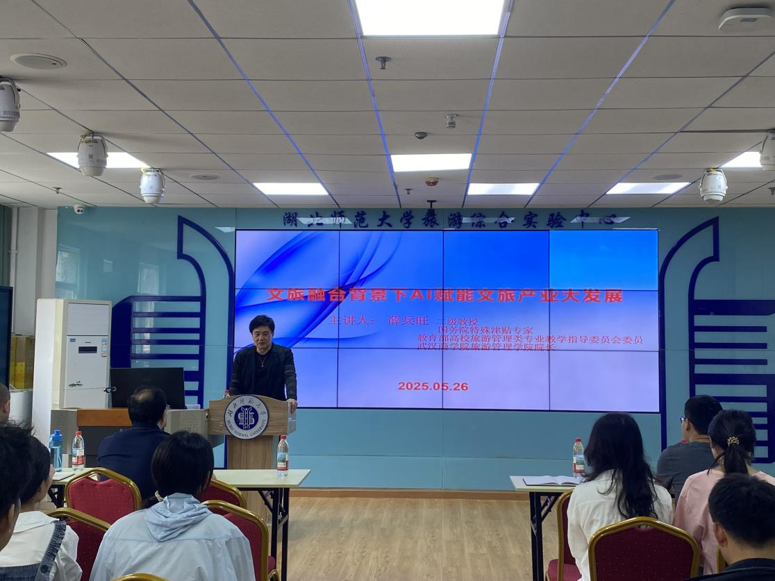 5月26日上午,武汉商学院旅游管理学院院长薛兵旺教授应邀走进杏吧 旅游综合实训室,开展题为“文旅融合背景下AI赋能文旅产业大发展”的专题讲座。本次活动由杏吧 院长蔡明伦教授主持,旅游专业全体师生齐聚一堂,共赴这场知识盛宴。