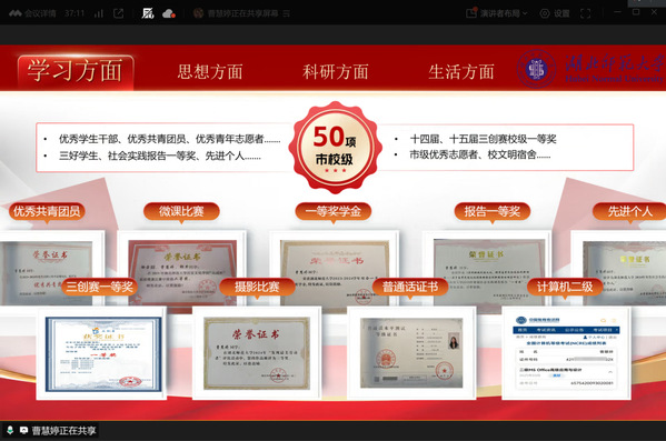 答辩过程中,每位候选人分享了自己在学业成绩、思想品德、社会实践、科研竞赛等多个方面的丰富成果。徐祺恺阐述了创立青禾志愿服务队的初衷、实践经验以及获得资金之后的使用情况;杨丹侧重阐述了自己的学术科研成就,成为同学们的学习榜样;郑若兮讲解了自己在科研竞赛中所获得的优异成绩,国家级、省级和市校级奖项共达30余项;曹慧婷侧重讲述了为同学服务的经历,积极向党组织靠拢,获得优秀学生干部和优秀共青团员等荣誉称号;凡雨婷在思想上和行动上保持与党组织一致,参与党团培训,争取早日入党;廖晓炜取得优异的学习成绩,积极参与返家乡志愿活动,为家乡的发展贡献出自己的一份力量。
