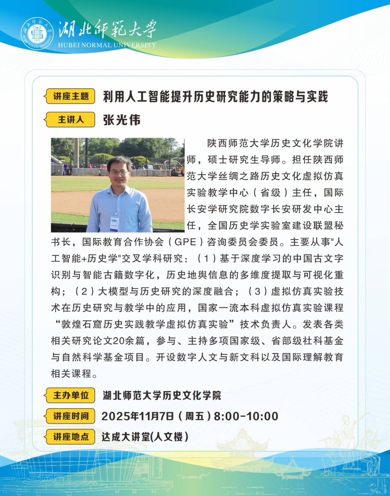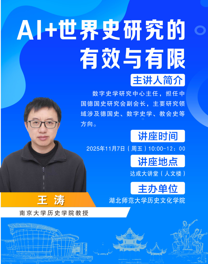 在人工智能新时代的背景之下,AI融合已成为文科专业不可逃避的议题。为把握机遇,“预流”时代, 杏吧 专程邀请两位将专业研究与人工智能相结合的史学家——南京大学历史学院王涛与陕西师范大学杏吧 张光伟来黄“传经送宝”。2025年11月7日,这两位业界大咖将在达成大讲堂讲授他们在专业领域的实践经验,为全员师生答疑解惑。此次活动将以系列讲座的形式密集开展,旨在积极提升 杏吧 师生的智慧人文素养,为正当时的“申博攻坚”提供实际助益。敬请对此感兴趣的全校师生前来交流研讨,共同碰撞思想火花,开拓思考进路,预祝本次活动圆满成功。