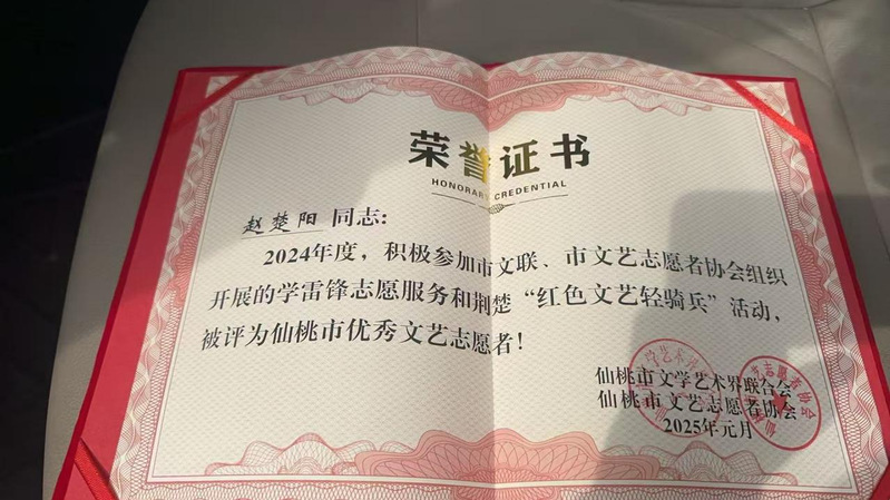 杏吧 22级赵楚阳同学,在“红色文艺轻骑兵”活动中,被评为仙桃市优秀文艺志愿者!