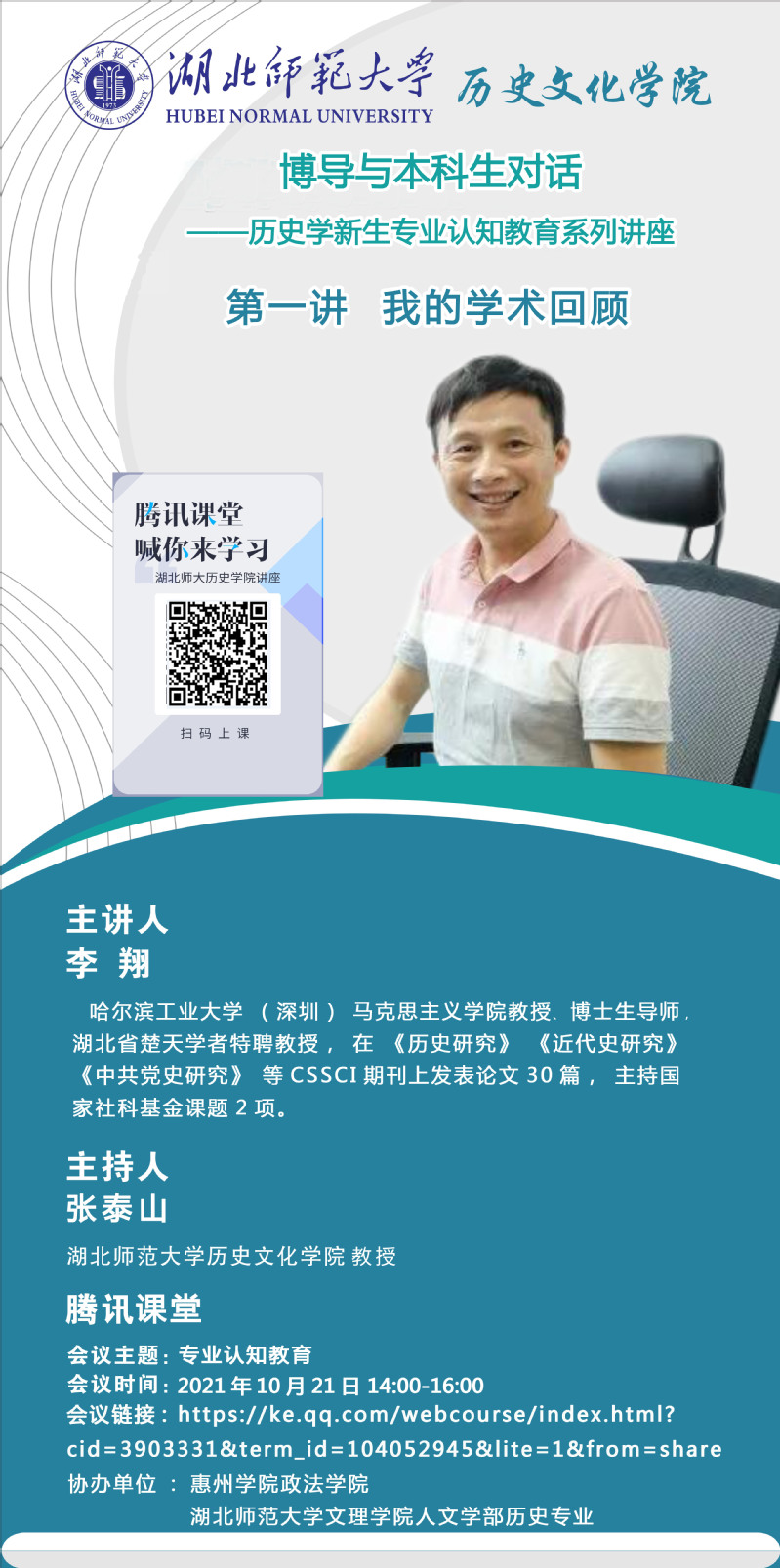 第一讲于2021年10月21日通过腾讯课堂,邀请哈尔滨工业大学(深圳)马克思主义学院李翔教授做主题为“我的学术回顾”线上讲座。会议由杏吧 张泰山教授主持。