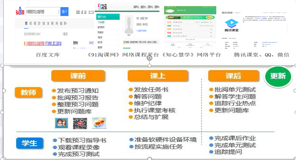 教学设计 | 课前,教师将课前学习资源上传到课程平台,并通过手机邮箱、QQ 群、微信等发布课前预习通知。 学生接到预习通知后,下载电子课本、导学案、教师录制的微课程、教学动画、教学视频等信息化教学资源进行自主学习,拓展了学习的时间与空间。 课上,利用腾讯课堂教学软件进行任务书的下发,学生按照任务书要求 以小组为单位,实施任务作业,教师针对提问学生进行屏幕控制,一对一手把手指导,实现差异化教学。并利用教师课堂打卡程序,作业评优秀模范程序,进行课堂实训即时考核。最后教师总结并布置课后作业。 课后,学生通过网络课程平台QQ作业功能完成课后作业和单元测试,并对 感兴趣、有疑问的问题进行提问。教师利用线上平台远程答疑或线下家访解惑。