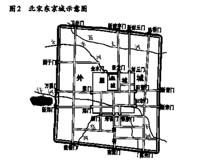 通过读图2,认识北宋东京城的规模和布局特点。北宋东京城分为皇城、里城和外城三层。皇城基本居于里城中心偏北位置,里城位于外城中心。坊市界限被打破,城市布局不完整、不规则了。东京有“四水贯都”之称,汴河、蔡河、五丈河、金水河都通过护城河互相连接。汴河穿城而过,三重城垣都与水道