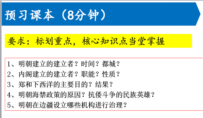 一、明朝政治制度的变化 | 给学生8分钟时间预习课本,圈画教材基础知识。