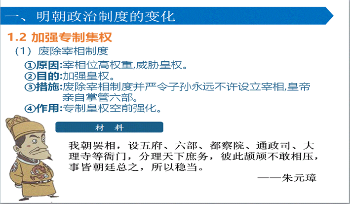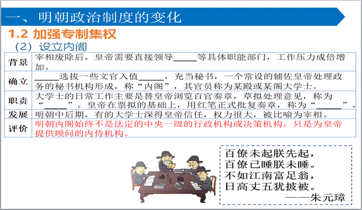 废丞相、建立内阁的史实,明朝政治体制的变化;明朝面临的内部和外部问题。