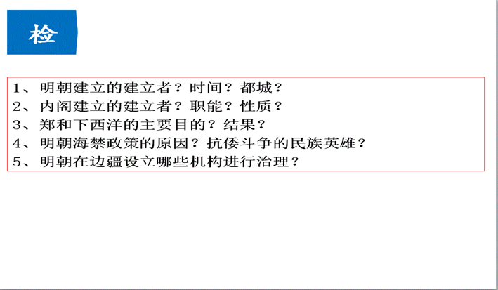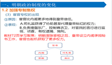 教学反思 | ①时间分配不好,前紧后松,学生有些跟不上,需注意、加强对课堂节奏的把握。②知识点之间的严谨性还有待加强,比如“如何由内阁过渡到司礼监”。备课还需进一步加强,多下功夫,真正把“备教材”、“备学生”、“备教法”落到实处。 | ||