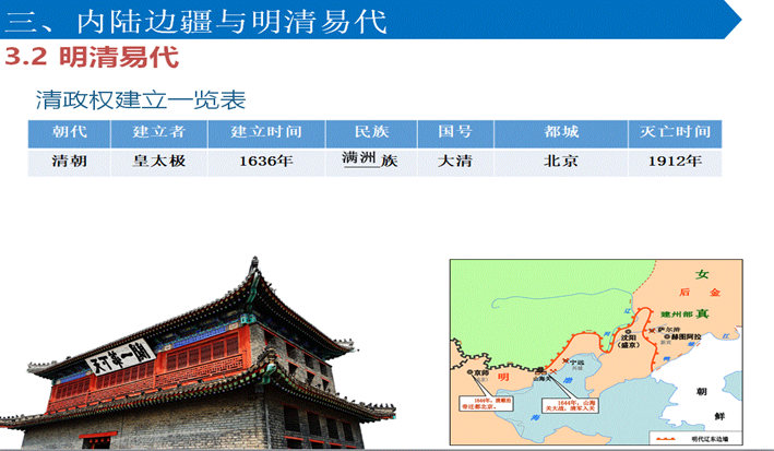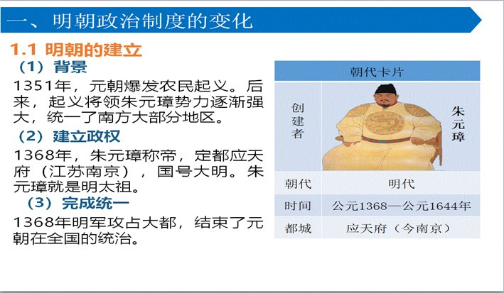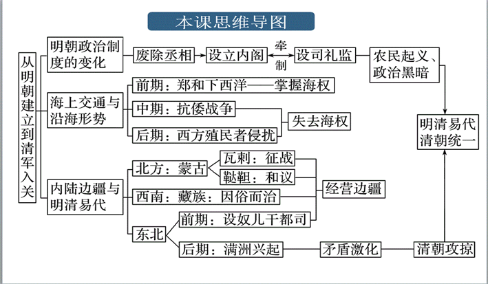 本课是人教版高中历史中外历史纲要第4单元第13课。本课共3目,分别是明朝政治体制的变化,海上交通与沿海形势,内陆边疆与明清易代。