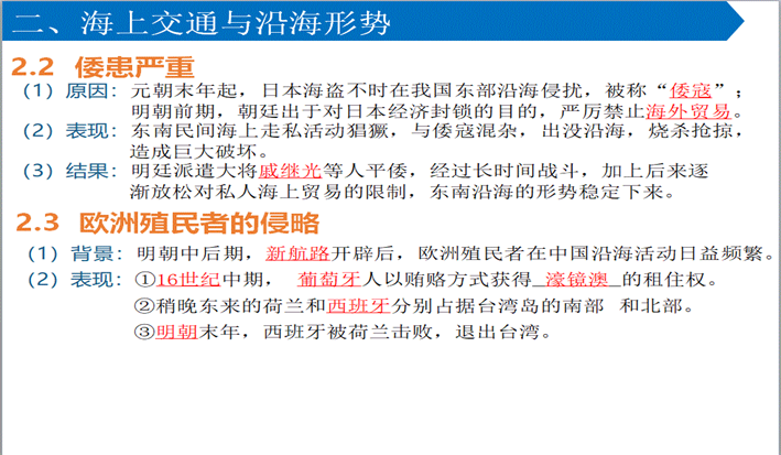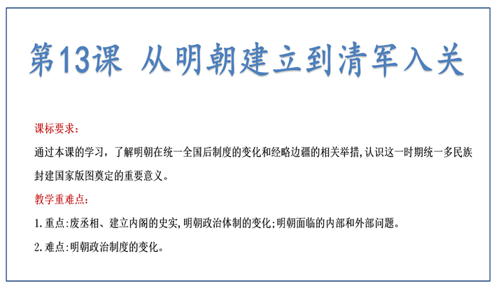 第13课 从明朝建立到清军入关 一、明朝政治制度的变化 二、海上交通与沿海形式 三、内陆边疆与明清易代 | |||