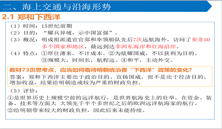 二、海上交通与沿海形式 | 教师分析郑和下西洋的特点,加深学生理解。师生合作探究教材思考点:郑和下西洋政策的变化。