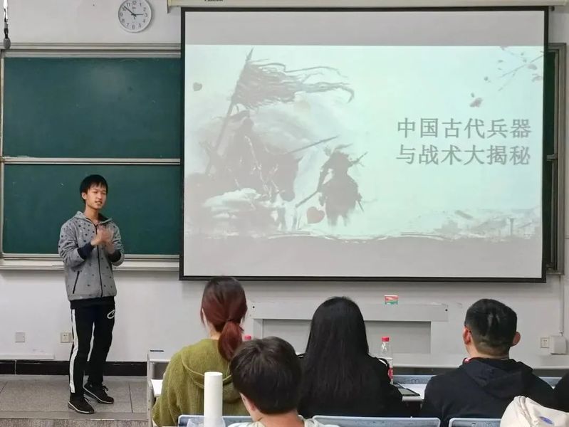 同学们组成十个小组,以军事理论课相关教材知识为基础,进行深化延伸、大胆创新,设计课前十分钟分享内容并制作PPT,由小组代表依次上台结合PPT进行讲演。在比赛过程中,无论是同学们慷慨激昂的讲述还是精心准备的PPT,都充分展现了同学们活力的青春风采和日积月累下的知识储备。每组的十分钟分享里既有追溯中国古代军事谋略的经典之作——孙子兵法,也有回顾中国古代悠久的兵器发展史;既有聚焦如“解放战争中的三大战役”“诺曼底登陆战役”“海湾战争”等堪称传奇的经典战例,也有针对“纳粹德军闪电战”的详细研究;更有对我国新时代国防政策的有力宣传以及疫情新常态下我国所面临的复杂安全形势的精彩解析。