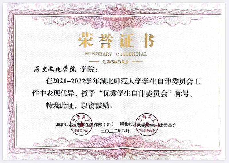 荣获“优秀学生自律委员会称号”。