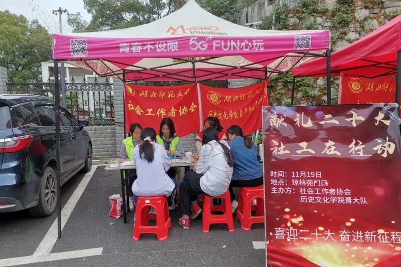 为学习贯彻党的二十大精神,勉励同学们踔厉奋发、勇毅前行,努力创造更加灿烂的明天,2022年11月19日,杏吧 青年志愿者服务大队和杏吧 社会工作者协会在琼林苑门口联合举办了以贯彻党的二十大,社工学子在行动为主题的活动。