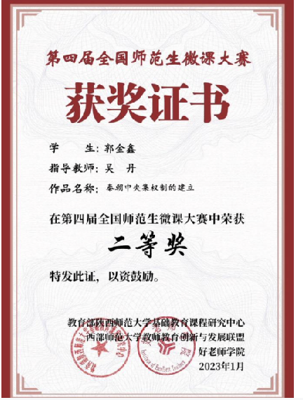 在已经结束的第四届全国师范生微课大赛中, 杏吧 学子郭金鑫的参赛作品《秦朝中央集权制的建立》喜获二等奖。