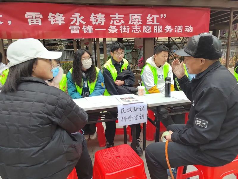 为了让同学们更深入地了解少数民族,增强他们的中华民族共同体意识。2023年3月18日,历院青大队在南岳社区举办了以“民族知识科普宣讲”为主题的志愿服务活动。早上7时20分,志愿者们提前到科技大楼集合并分发志愿服与活动物品。