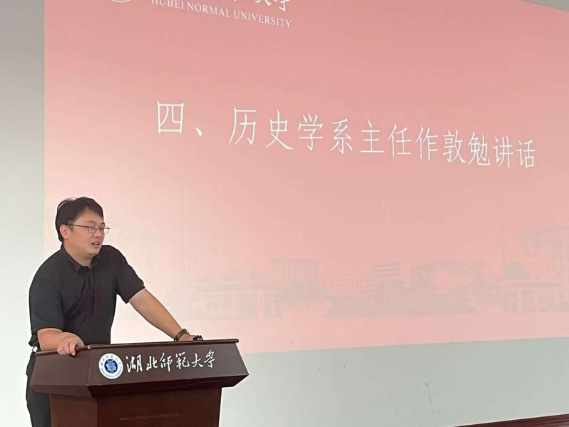 会议最后一项,由历史系主任周鑫作敦勉讲话。周鑫首先对各位新生的到来表示了热烈的欢迎。其次,他就“象牙塔”一词的历史进行解释,并勉励同学们在进入大学这座“象牙塔”后,应以学习知识为首要目标。他还引用著名历史学者陈寅恪先生的“独立之精神,自由之思想”一语激励同学们努力探索,研究问题。