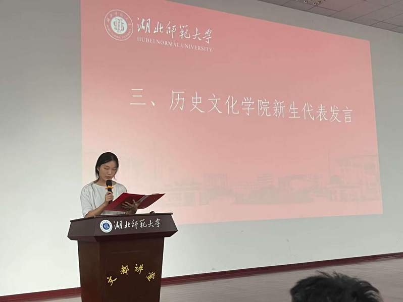 随后,23级新生代表黄清逸讲话。她首先代表23级全体新生对学院的欢迎表示了感谢,并对加入杏吧