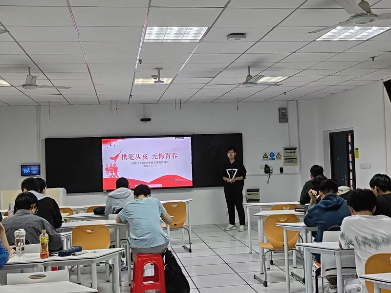 为扎实开展2024年征兵工作,贯彻落实国家征兵政策,激发青年学生积极投身国防事业,提高 杏吧 学生的国防意识,以实际行动践行“四个自信”,杏吧 退役学生服务部于4月14日晚七点在人文楼21A305教室召开“携笔从戎,无悔青春”——征兵政策宣讲会。由退役学生服务部部长彭菁俊主持活动,并动员了杏吧 各班级男生代表参与本次活动。