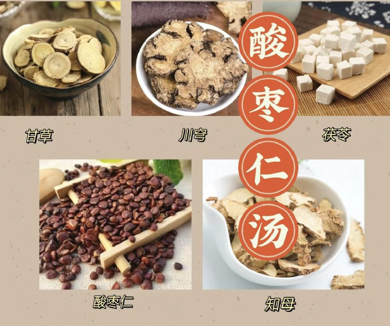 成分:知母、甘草、茯苓、酸枣仁、川芎