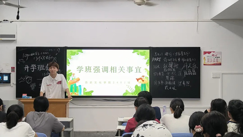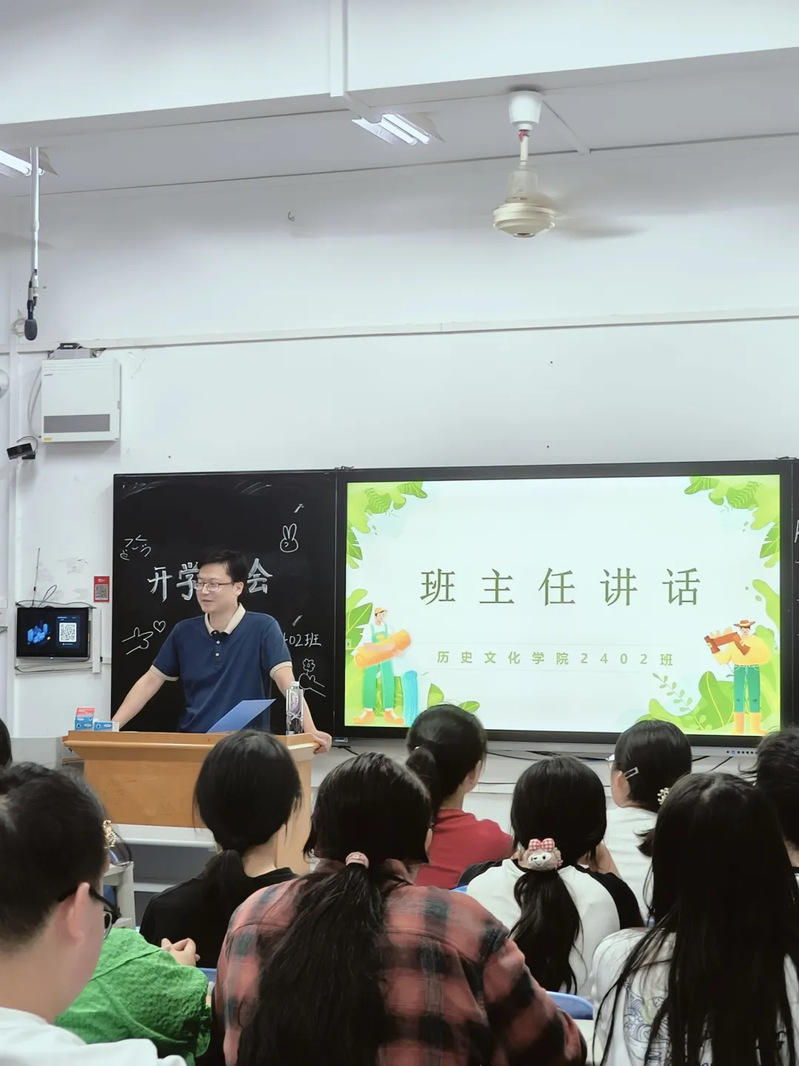 在班会第一项环节中,班主任李志刚老师发表了热情洋溢的讲话。首先,他对同学们的到来表示了热烈的欢迎,并寄予了殷切期望。李老师希望同学们能够珍惜大学四年的宝贵时光,努力成为一个“会读书、能做事”的人。他鼓励大家广泛阅读历史学方面的相关书籍,同时也不局限于本专业,要博览群书,不断充实自己。李老师希望同学们在未来四年里通过努力,在湖师遇见一个更优秀的自己。