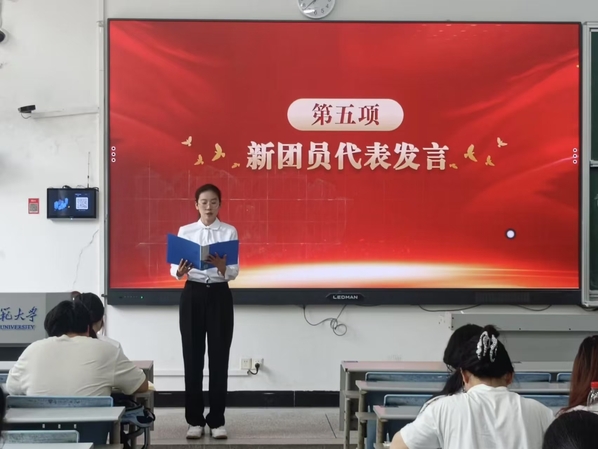 在优秀团员代表邓雯的带领下,新团员们面向团旗,右手握拳,庄严宣誓:“我志愿加入中国共产主义青年团……”铿锵的誓言回荡在会场,彰显着青春的热血与坚定的信念。宣誓结束后,新团员代表王思怡发言,表达了对团组织的向往和今后努力奋斗的决心;优秀团员代表戴世媛则结合自身经历,鼓励新团员在学习和实践中锤炼本领,争做新时代有为青年。