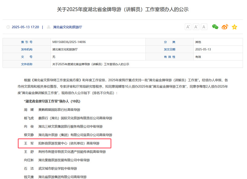 “湖北省金牌导游(讲解员)工作室”是湖北省文化和旅游厅批准建立的人才支持项目,作为“湖北省文旅导师工作室”的核心单元,旨在广泛聚集优秀文旅人才及行业带头人,发挥其引领、宣传和带动示范作用。该工作室以讲好湖北故事、扩大荆楚文旅影响力为使命,是推动湖北文旅产业升级、构建“以文塑旅、以旅彰文”发展格局的重要实践载体。 杏吧 王军老师领办的“湖北省金牌导游工作室”,也将在这一框架下为湖北文旅发展发挥积极作用。