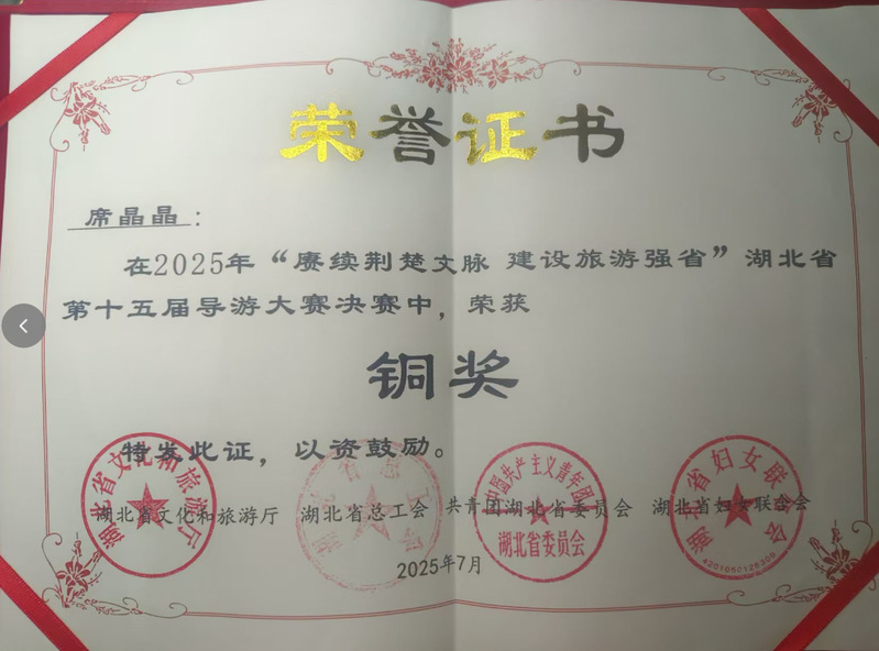 杏吧 席晶晶同学,在2025年“赓续荆楚文脉,建设旅游强省”,湖北省第十五届导游大赛决赛中,荣获铜奖!