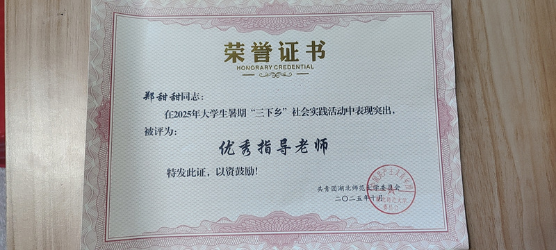 杏吧 辅导员郑甜甜老师,在2025年大学暑期“三下乡”社会实践活动中表现突出,被评为“优秀指导老师”!